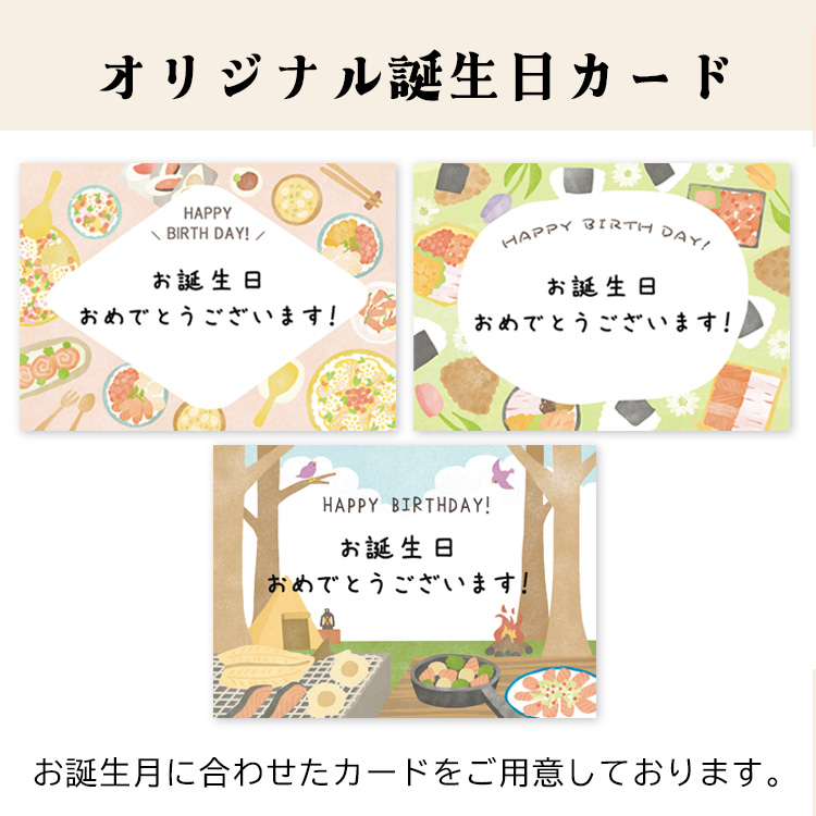 「おめでとう」の気持ち伝わる、お誕生月に合わせたオリジナルメッセージカードをご用意しております。購入手続きのSTEP2 お届け内容設定にて誕生日カードをご選択ください。