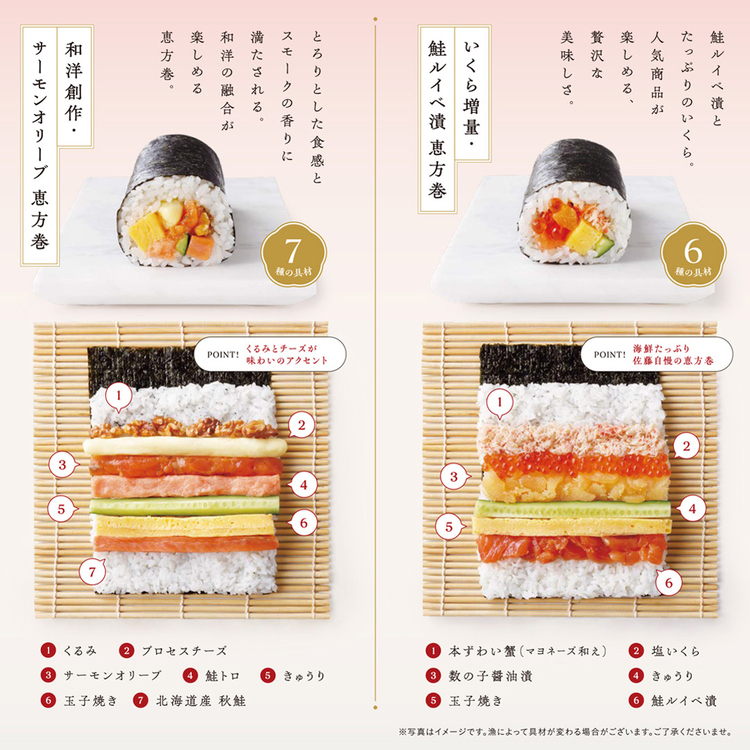 くるみ、プロセスチーズ、サーモンオリーブ、鮭トロ、きゅうり、玉子焼き、北海道産秋鮭 |