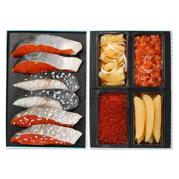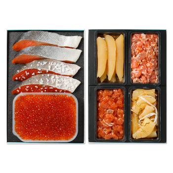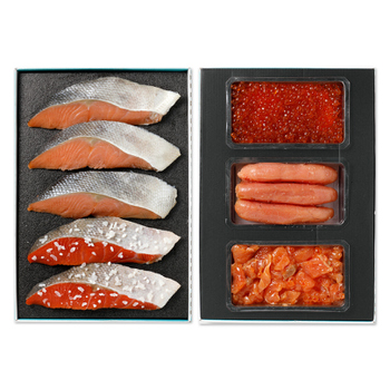 紅鮭甘塩口2枚、銀鱈さざ浪漬2枚、紅鮭さざ浪漬2枚、ひとくち数の子松前120g、鮭ルイベ漬130g、いくら醤油漬120g、数の子醤油漬100g |