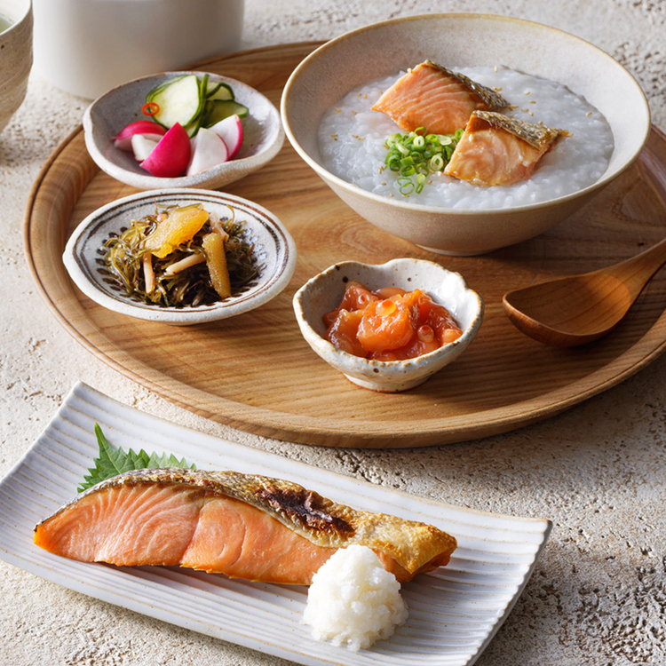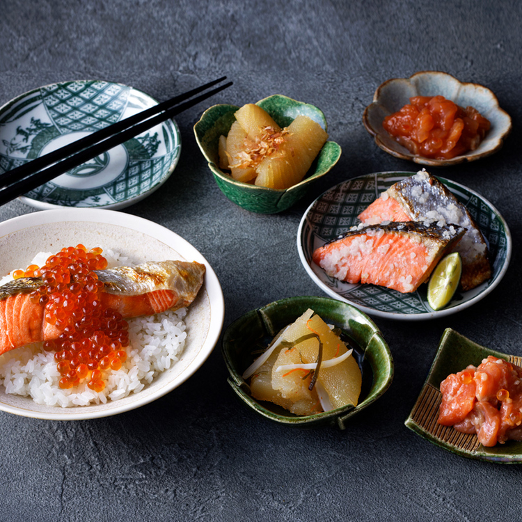熟成新巻鮭3枚、紅鮭さざ浪漬2枚、いくら醤油漬120g、近海たらこ140g、鮭ルイベ漬130g |