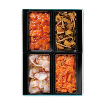 鮭ルイベ漬130g、数の子入松前漬120g、たこわさび130g、サーモンオリーブ130g |