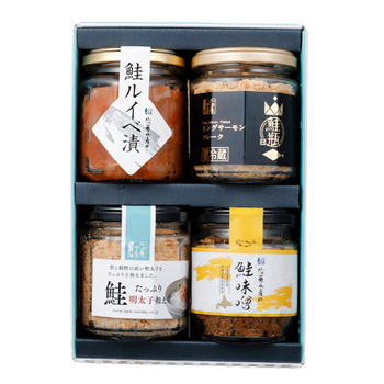 鮭ルイベ漬140g、キングサーモンフレーク90g、鮭たっぷり明太子和え100g、鮭味噌90g |