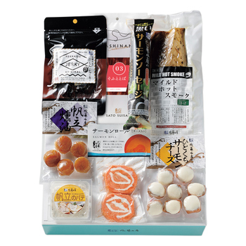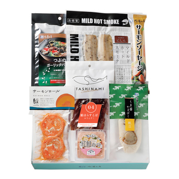 つぶのガーリックバター風味、マイルドホットスモークにしん、サーモンソーセージ、サーモンロール2個入、鮭はらすとばみりん干し、紅鮭のパテ、熊笹かまぼこ帆立 |