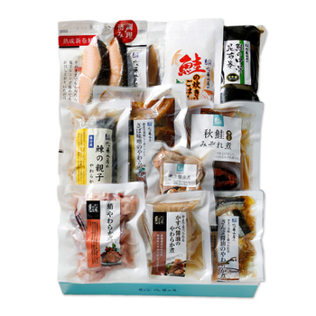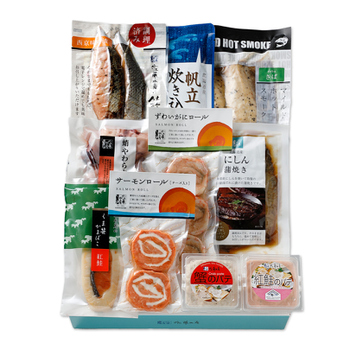 鮭焼切身熟成新巻鮭、鮭の炊き込みごはんの素、鮭の中骨昆布巻、鰊の親子やわらか煮、さば味噌のやわらか煮、秋鮭みぞれ煮、帆立醤油煮、蛸やわらか煮、かすべ醤油やわらか煮、さんま醤油のやわらか煮 |