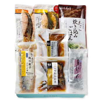 鮭焼切身西京味噌漬、鮭焼切身塩レモン、たこ炊き込みごはんの素、さば味噌のやわらか煮、鰊の親子やわらか煮、つぶのやわらか煮、にしん昆布巻 |