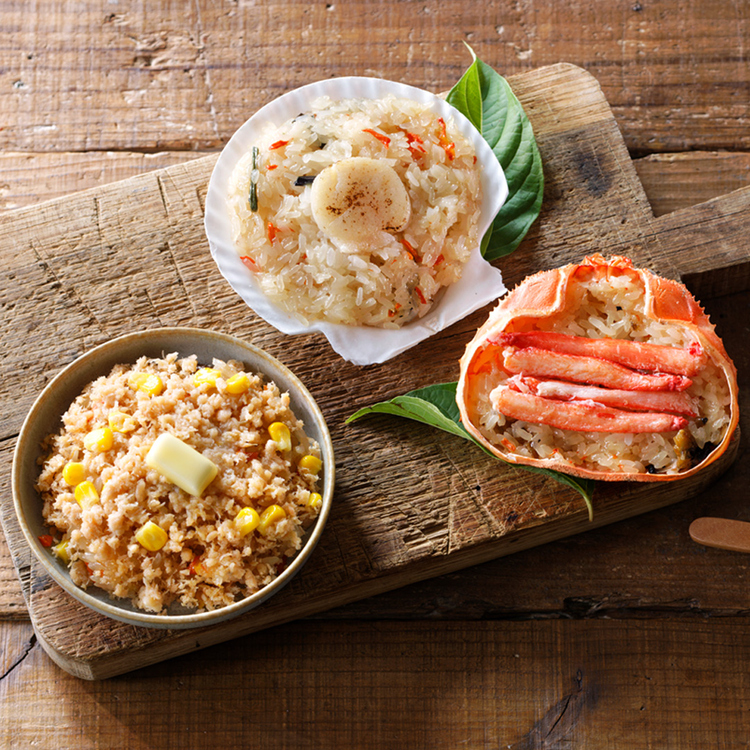 蟹おこわ120g×2、本ずわい蟹のドリア130g×2 、鮭バターコーンおこわ140g×2 |