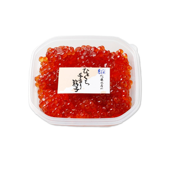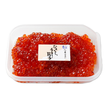 本物の筋子を作るためには中心部まで塩を浸透させますので、ある程度の辛さに仕上がります。手まり筋子は、ひとくちサイズにしてから漬け込むので、塩分の浸透圧が早く、一本物の筋子より塩分も少なくてすみ、均等かつ低塩の筋子になり、甘口で味わい深い筋子になるのです。